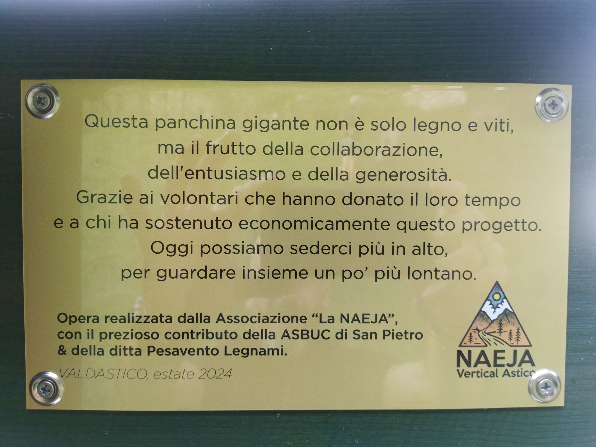 Associazione ViviValdastico, per l'idea iniziale e il lavoro svolto fino alla chiusura. Associazione Naeja, per aver portato a termine il progetto con dedizione e passione. I volontari locali, che hanno messo a disposizione il loro tempo e le loro energie per l'installazione. I maestri artigiani, che hanno realizzato la panchina con cura e precisione. I donatori del terreno, che hanno reso possibile la collocazione della panchina in questo splendido luogo. A.S.B.U.C., per il loro contributo fondamentale nel supporto al progetto. I sostenitori e i donatori, che hanno reso possibile il progetto grazie al loro supporto. Grazie a tutti per aver contribuito a trasformare questa visione in realtà! |